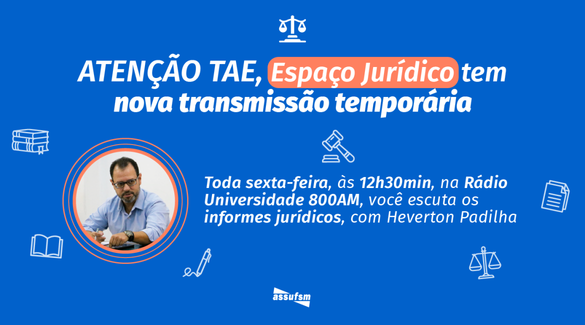 TAE, a Assufsm informa que, temporariamente, o Espaço Jurídico, com o Advogado Heverton Padilha, da Wagner Advogados Associados, está ocorrendo às sextas-feiras, a partir das 12h30min, na Rádio Universidade 800AM. A alteração ocorre devido a mudança de prédios que a Rádio Universidade está passando no momento, do 10º andar do...
