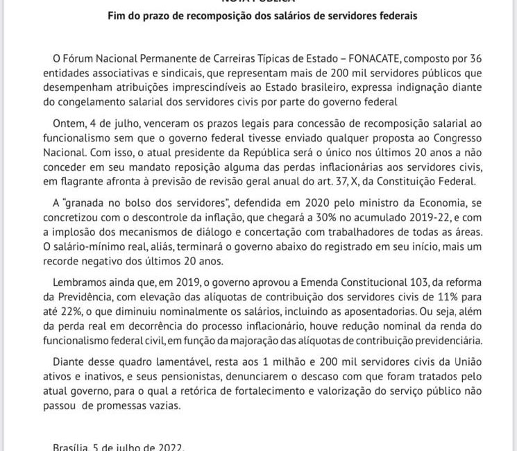 Nota Pública FONACATE: Fim do prazo de recomposição dos salários de servidores(as) federais