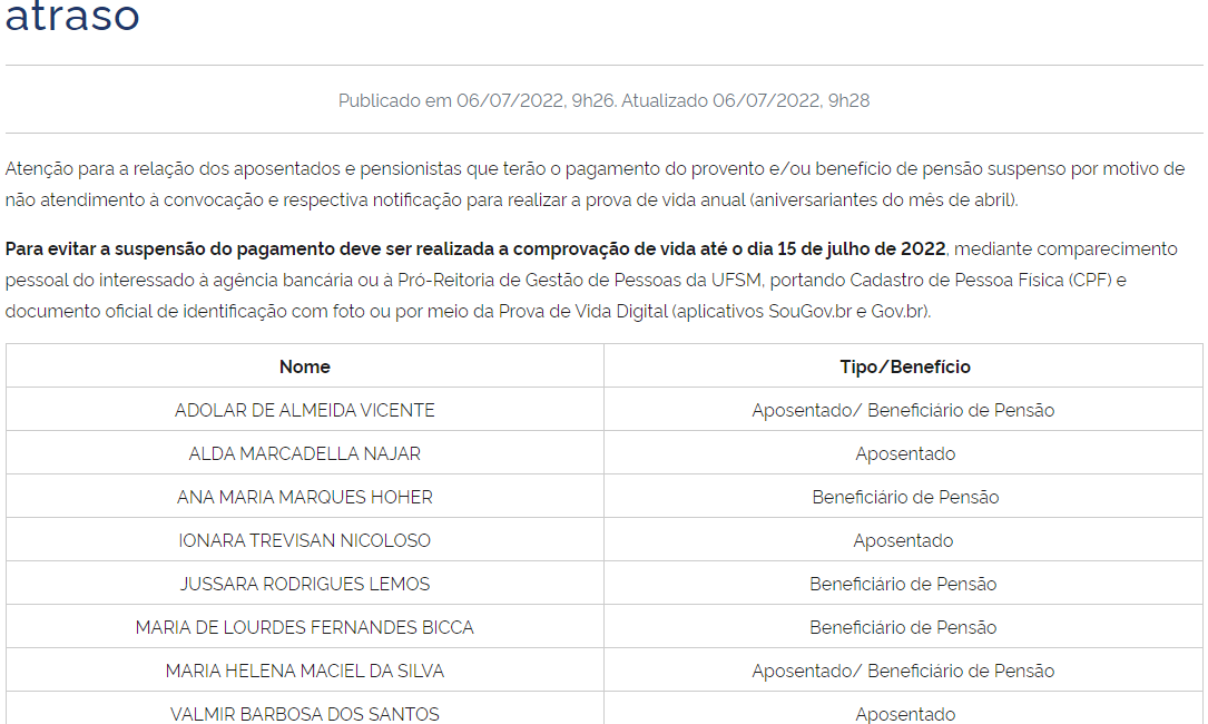 Atenção aniversariantes do mês de abril, que estão com a prova de vida em atraso, segue abaixo a relação dos aposentados(as) e pensionistas que terão o pagamento do provento e/ou benefício de pensão suspenso por motivo de não atendimento à convocação e respectiva notificação para realizar a prova de vida...