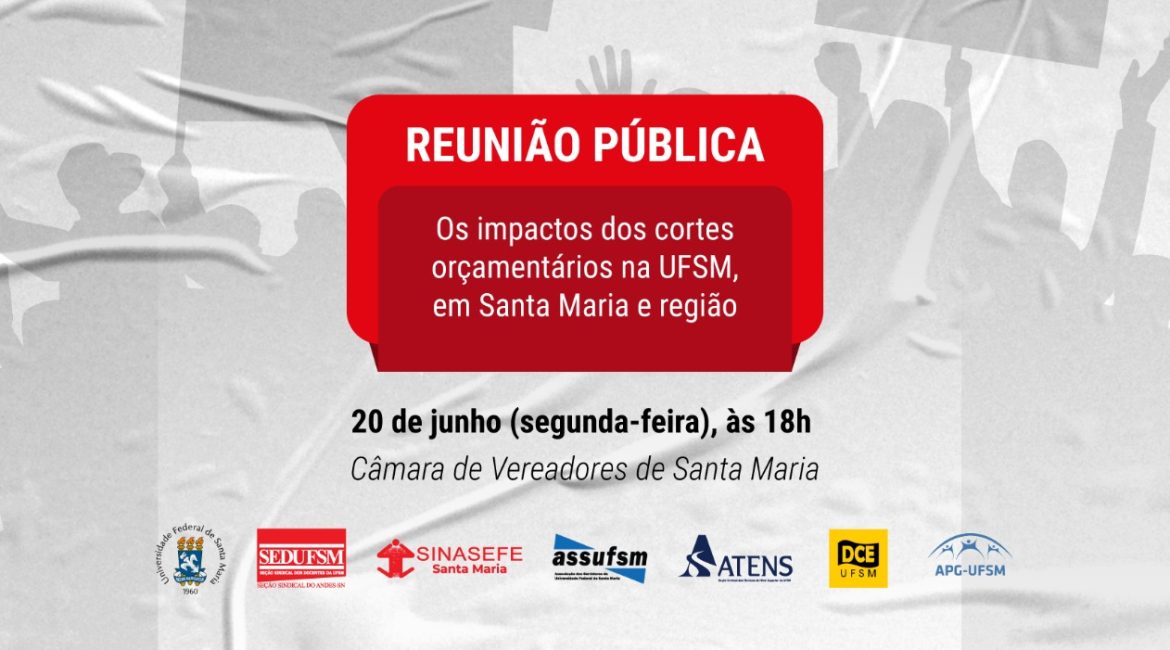Na próxima segunda, 20 de junho, às 18h, ocorre uma Reunião Pública na Câmara de Vereadores(as) de Santa Maria para tratar dos cortes orçamentários na UFSM. A atividade, na qual estão envolvidas Sedufsm, Assufsm, Sinasefe, Atens, DCE, Associação de Pós-Graduandos (APG) e a própria reitoria da instituição, faz parte do...