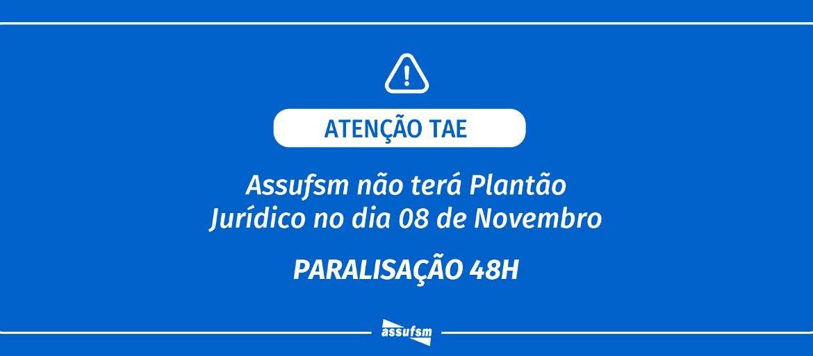 Quarta-feira é o tradicional dia de Plantão Jurídico na Assufsm, com atendimentos do escritório Wagner Advogados. No entanto, em razão da Paralisação 48h, informamos que, na próxima quarta (08), a agenda estará fechada e não serão realizados atendimentos. Além disso, neste dia, o Espaço Sindical com informes jurídicos para a categoria...