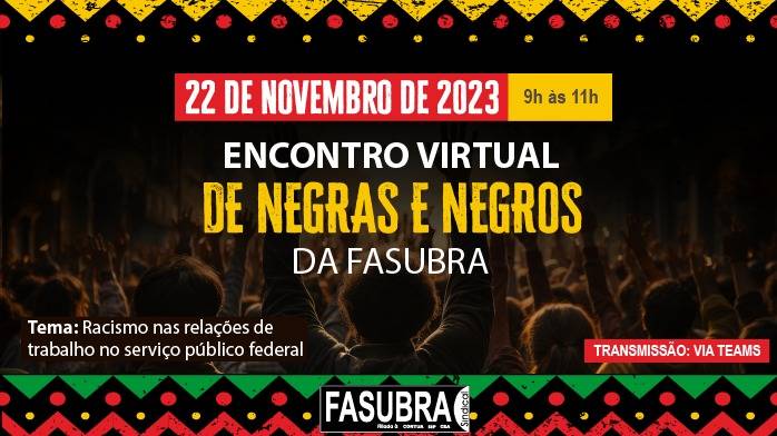 A Direção Nacional, por meio da Coordenação de Raça e Etnia, em conjunto com a Coordenação da Mulher Trabalhadora, realizará na próxima quarta-feira, dia 22 de novembro de 2023, das 9h às 11h (Brasília/DF), o “Encontro Virtual de Negras e Negros da FASUBRA”, que terá como tema “Racismo nas relações...