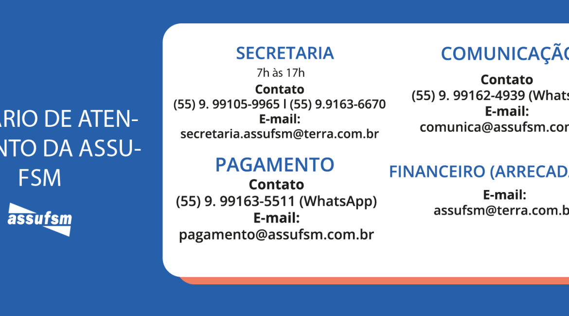 A Assufsm informa alterações de horário na Secretaria, em razão do fim das férias letivas da UFSM. A partir de hoje (07), as funcionárias da Assufsm estarão atendendo de segunda à sexta-feira, das 7h às 17h, sem fechar ao meio-dia, na sala 217, no 2° andar do prédio da Reitoria....