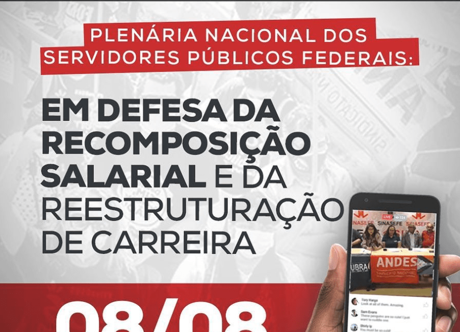 A Plenária Nacional dos servidores públicos em defesa da recomposição salarial e da reestruturação de carreira acontecerá HOJE, dia 08/08, às 18h. Para se inscrever basta se inscrever no link: https://forms.gle/pDkq8hLorTGYTo8T8 Lembrando que quem se inscreveu na data anterior, não precisará realizar nova inscrição Confira também a nova Carta Aberta...