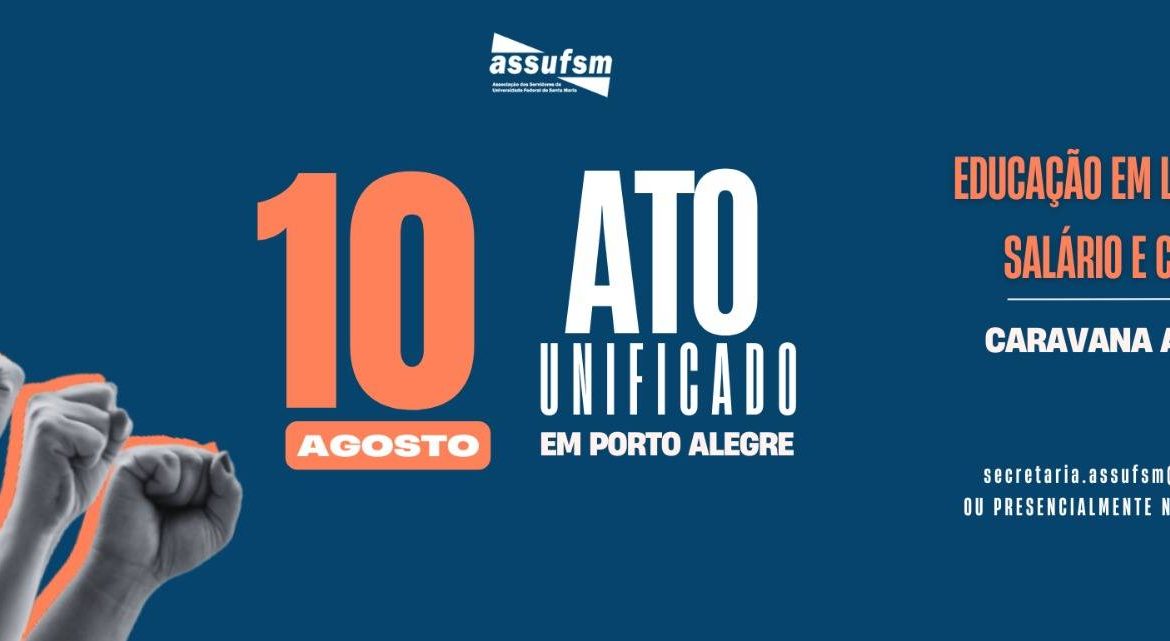 Conforme deliberação da Assembleia Geral da categoria [veja aqui], a Assufsm vai participar do Ato Unificado, construído em conjunto com outras universidades do RS - em Porto Alegre, na próxima quinta-feira, dia 10 de agosto. A mobilização visa chamar a atenção do Governo que, neste dia, deve dar uma devolutiva...
