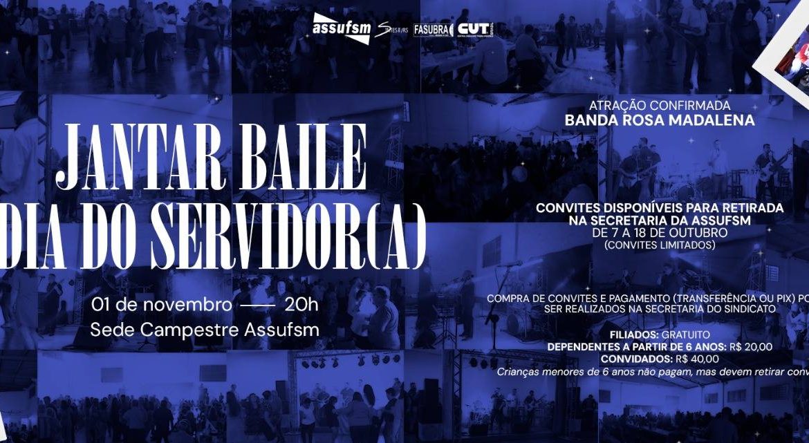 Em comemoração ao Dia do(a) Servidor(a) Público(a), a Assufsm convida seus filiados e filiadas, dependentes e convidados(as) a participarem do tradicional Jantar Baile do(a) Servidor(a). Neste ano, a comemoração será no dia *1º de novembro, às 20h, na Sede Campestre da Assufsm*, na Rua da ABS, no Bairro Lorenzi. A...