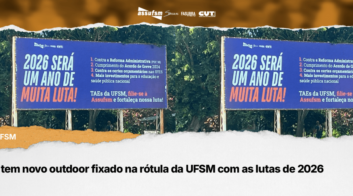 A Assufsm informa que o outdoor com temática sobre as lutas de 2026, incluindo a PEC 38 – Reforma Administrativa, o cumprimento do acordo de greve de 2024, contra os cortes orçamentários nas IFES e por mais investimento na educação e saúde pública nacional foi fixado na Rótula de acesso...