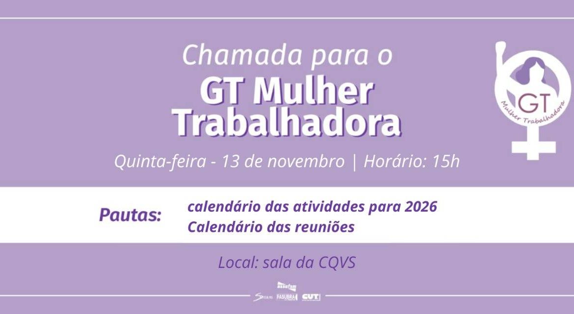 O GT Mulheres Trabalhadoras da Assufsm convida para reunião na próxima quinta-feira (13), às 15h na sala da CQVS, no prédio 48C. ️ Na pauta está a construção das atividades para 2026 e calendário de reuniões. Participe, TAE!