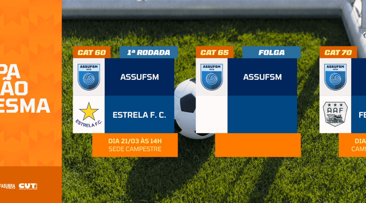 ⚽ Os times da Assufsm entram em campo no sábado, dia 21 de março, pela Copa Verão da AFUVESMA, com partidas na Sede Campestre. CATEGORIA 60 Anos – 1ª RODADA HORA: 14h LOCAL: Sede CampestreASSUFSM X ESTRELA F. C. CATEGORIA 65 Anos – FOLGA CATEGORIA 70 Anos – AMISTOSO HORA:...