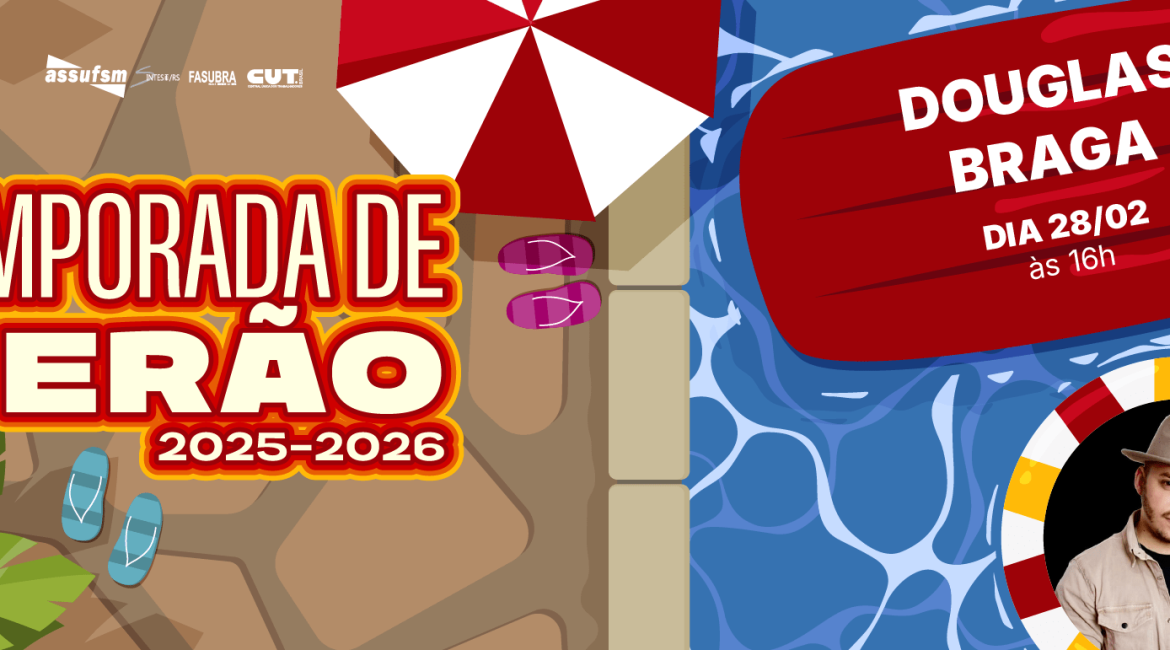 No sábado, dia 28 de fevereiro, o cantor Douglas Braga irá se apresentar na Sede Campestre da Assufsm. O Happy Hour inicia a partir das 16h, nos quiosques centrais para animar o final de sábado de nossos e nossas filiadas e convidados(as) que estiverem presentes. TAE, prestigie o Happy Hour...