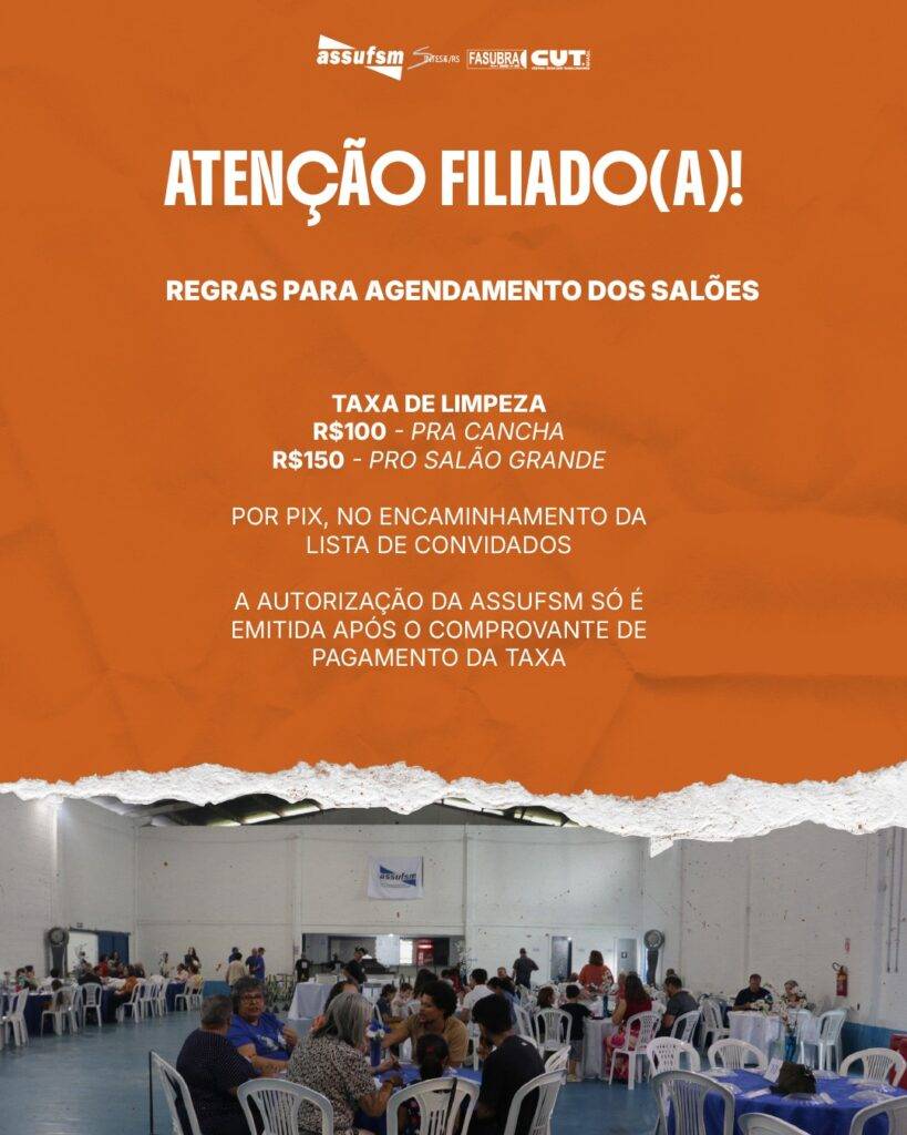 Além disso, a ASSUFSM comunica aos seus filiados e filiadas que os procedimentos para a reserva dos salões na Sede Campestre passaram por atualizações. O objetivo é garantir a organização, a higiene e o bom uso dos espaços comuns por todos(as).