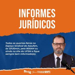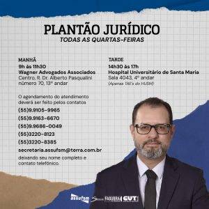 A Assufsm disponibiliza um plantão jurídico toda quarta-feira, das 9h às 11h30min, com os Advogados da Wagner Advogados Associados, via telefone ou WhatsApp, com agendamento obrigatório nos contatos: (55) 9.9105-9965; (55) 9.9163-6670; (55) 3220-8123 e (55) 3220-8385, além do e-mail secretaria.assufsm@terra.com.br.